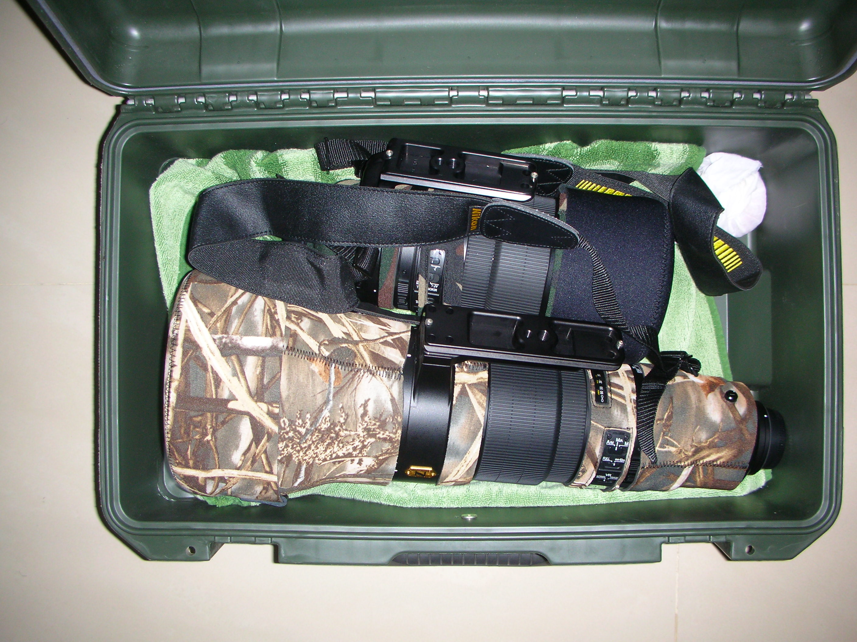 The second bag I’d recommend is a, Pelican 1510 or, a Stormcase iM2500 . Both are Airline carry on size hard cases. The Stormcase iM2500 is available at about INR 4000 and, the Pelican should be about the same as well. I wouldn’t bother with the divider set since that eats up the space. What one can do is wrap up ( with bath towels) the 600mm without the lens hood say along with a 300mm2.8 + one body in this case. On the 600 & 300 I will use a lens coat hoodie to protect the front element. 600 hoodie is the XXX model and the 300 hoodie is the X model. Maybe wrap the lens in towels and add a large canvas bag as a backup inside this hard case. Large canvas bag so that when in the field you can use the bag if needed. Additionally if you do get into airport carriage one bag restrictions, you are able to pile in stuff from both the backpack and the hard case into one bag and still board the aircraft with the canvas bag as a one bag carry on. If I was working from boats, a hard case would be handy. The military green hard case in the pic below is the Stormcase. This is the Stormcase iM2500 in which I took both my 600 & 300 on a boat at Mahul. The camera and small stuff was in the Lowepro Mini Trekker AW (the black and green backpack on the left, and the lens hoods went into the grey knapsack on the right). If I had the photo trekker or the Vertex 300, I would have had only one backpack.