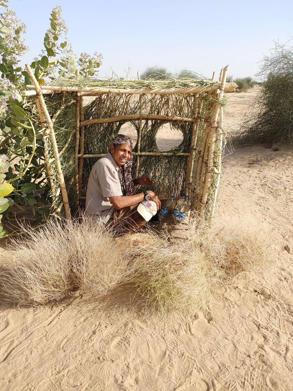 Musa was super confident that we will sight our first Great Indian Bustard (GIB) that morning. He had spotted on rather close to the fence the last evening. AS we approached the ares we saw a cowherd with some cows inside the fence. That put paid to the plans and sure enough, there was no bustard in sight ! Since we couldn’t spot any bustards in the morning evening we decided to stake out the Desert Fox den. The den had a few kits and it would give us some good interactions. Only it would be really really hot at 40 Deg Celsius and in open desert !